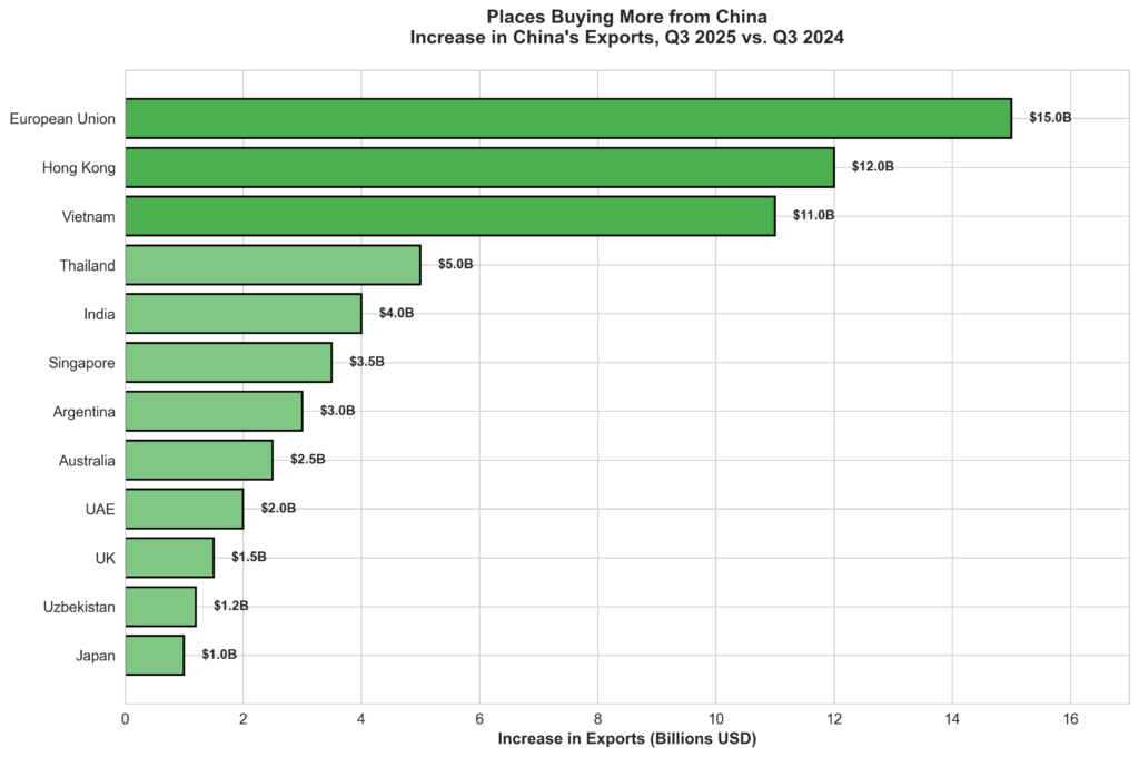 Figure 3: Countries in the European Union, as well as emerging economies like Vietnam and India, have significantly increased their imports from China, more than compensating for the decline in US purchases. The EU increased imports by $15 billion, Hong Kong by $12 billion, and Vietnam by $11 billion. Data source: Trade Data Monitor [1]
