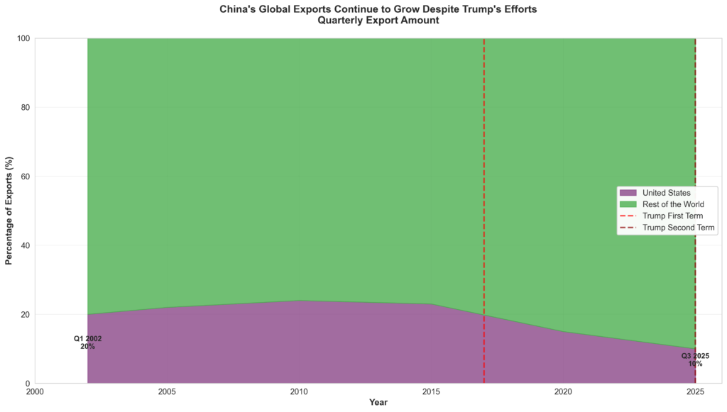 As the data demonstrates, the decline in US purchases has been more than offset by a surge in demand from the rest of the world. China’s quarterly exports have reached record levels, with the share of exports destined for the United States declining from 20 percent in the first quarter of 2002 to just 10 percent in the third quarter of 2025. This shift reveals not a victory for American trade policy, but rather a strategic reorientation of China’s export economy away from American dependence.