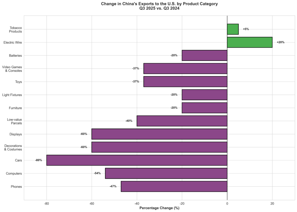 The following data illustrates the significant decline in US imports of key products from China—a decline that has been passed on to consumers in the form of higher prices and reduced availability. Between the third quarter of 2024 and the third quarter of 2025, the United States purchased substantially less of nearly every major product category from China [1]