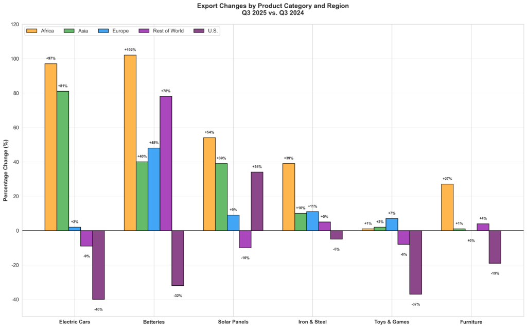 Table 1: Export changes by product category and region (Q3 2025 vs. Q3 2024). The data reveals China’s successful market diversification, with developing regions in Africa and Asia absorbing production that previously went to the United States. Data source: Trade Data Monitor [1]